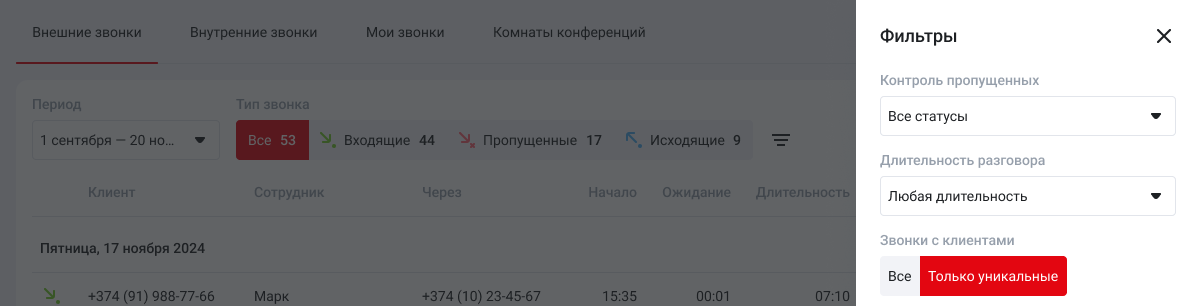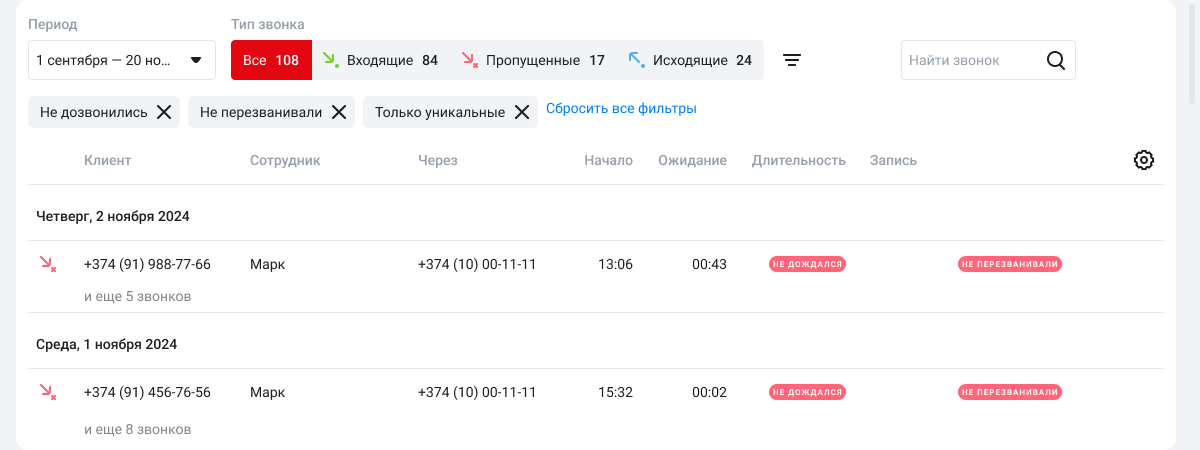 Фильтр «Контроль пропущенных» отображается в панели фильтров, когда выбраны типы звонков «Все», «Входящие» или «Пропущенные». При выборе типа звонков «Исходящие» фильтр «Контроль пропущенных» недоступен.Благодаря фильтру «Контроль пропущенных» вы сможете легко найти непринятые звонки, на которые сотрудники не перезванивали или не дозвонились.