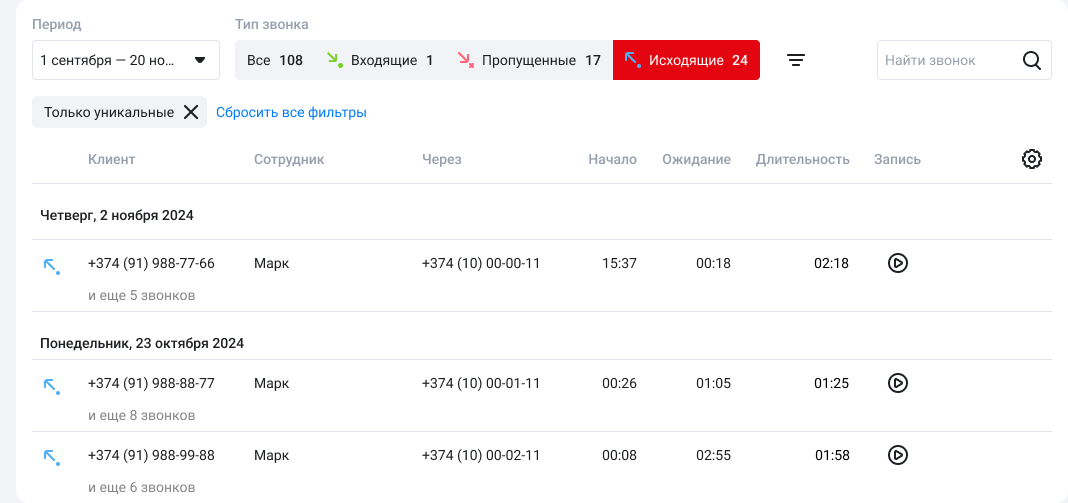 Также фильтр по уникальным звонкам показывает общее количество вызовов по каждому клиенту. Чтобы просмотреть полную историю общения с клиентом, кликните на его номер.