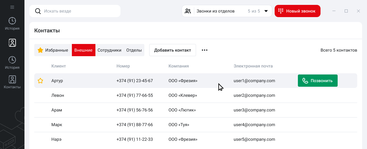 Все контакты синхронизируются между мессенджером и веб-интерфейсом АТС. Ключевые сведения о клиентах будут под рукой у каждого сотрудника. А чтобы не афишировать персональные контакты других руководителей, можете ограничить к ним доступ — такие контакты будете видеть только вы.