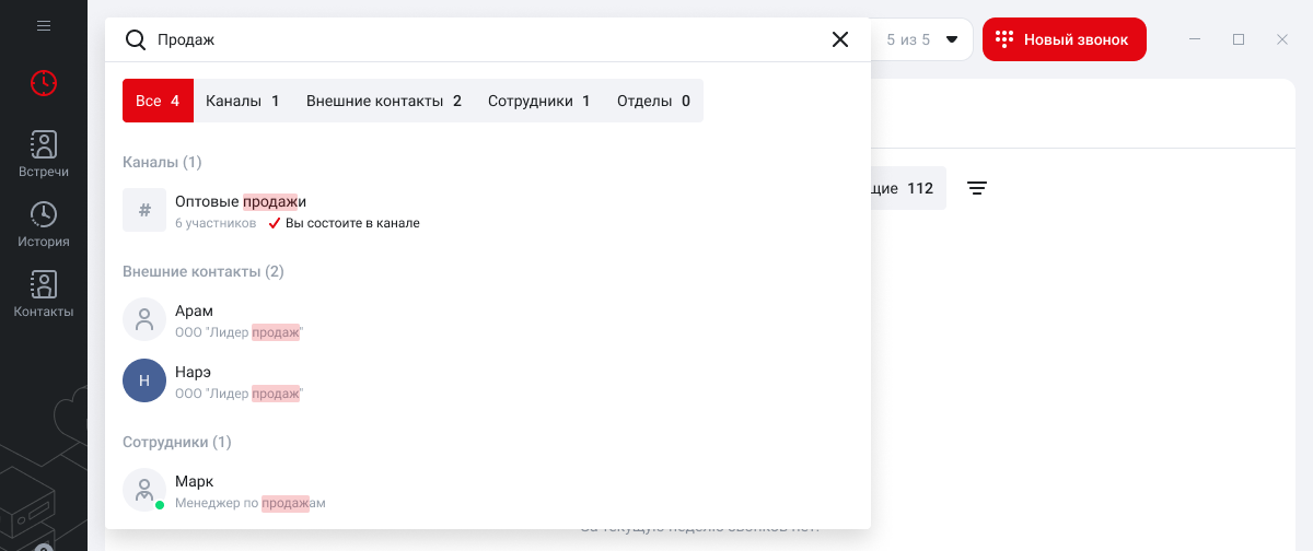 Чтобы быстро найти нужного клиента, коллегу или канал, воспользуйтесь единым окном поиска. Прямо из окна поиска можно написать или позвонить контакту.