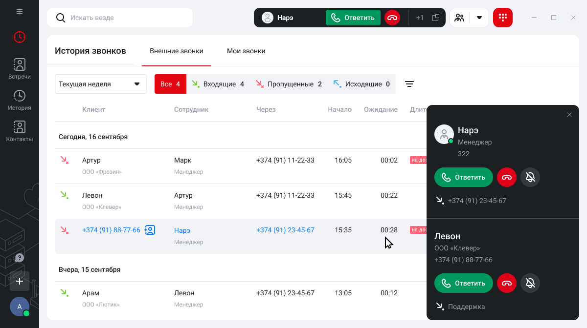 Чтобы не терять пропущенные, их число отображается в боковом меню и на вкладках в истории звонков. Здесь вы сможете узнать больше о контакте и быстро ему перезвонить. Гибкая система фильтров помогает найти любой звонок в архиве и при необходимости прослушать его запись.