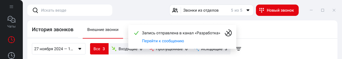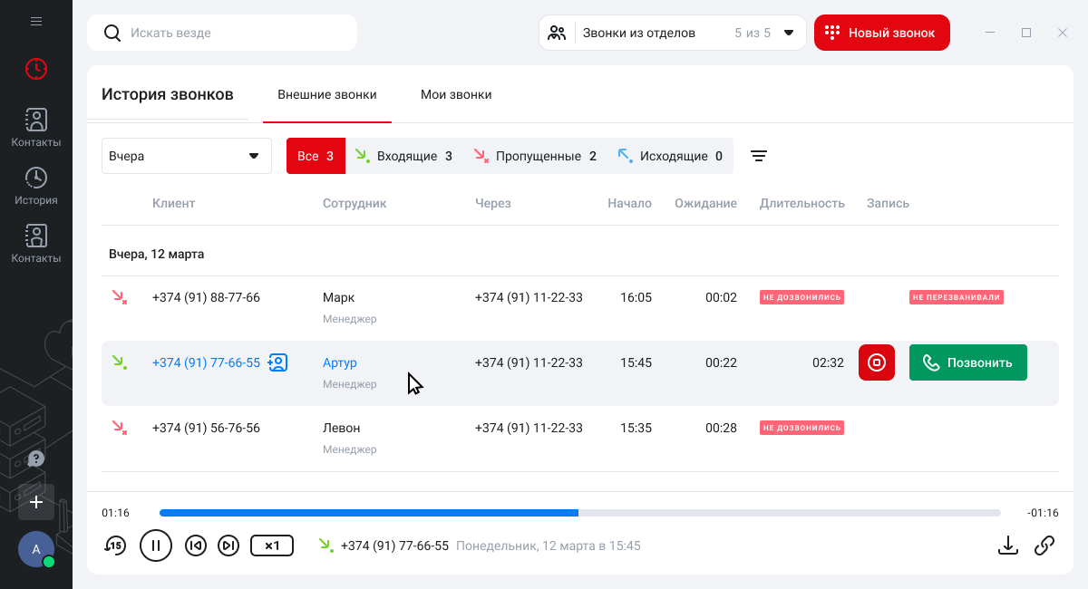 При переходе в историю новый пропущенный звонок подсвечивается красным. Уведомление исчезает, если долго держать вкладку с новым пропущенным открытой или если кто-то из сотрудников перезвонит этому контакту. Чтобы перезвонить по пропущенному, наведите курсор на соответствующую строку и нажмите на кнопку «Позвонить» справа.