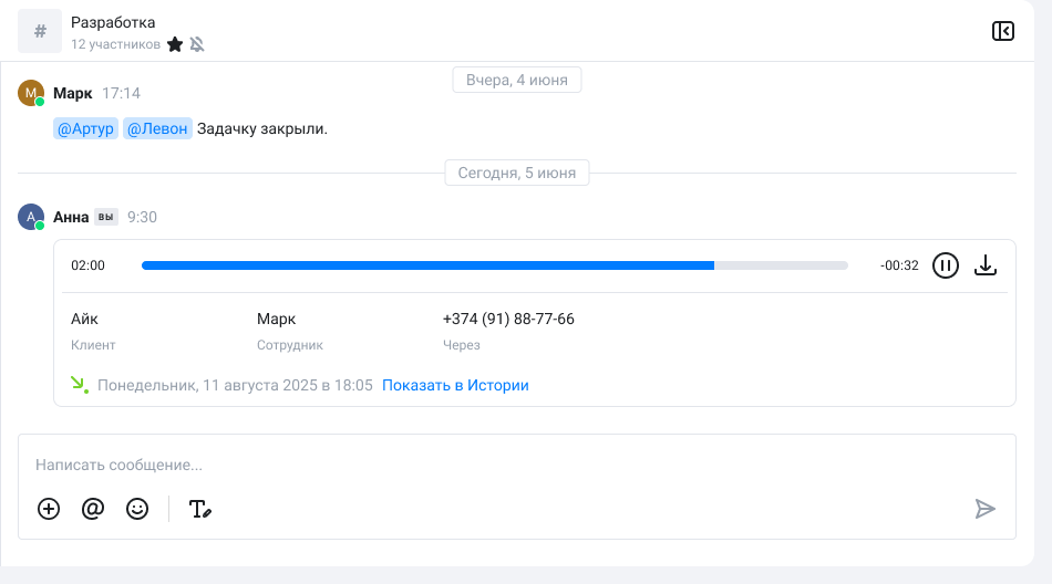Чтобы поделиться записью звонка в чате, в проигрывателе нажмите на иконку ссылки в правом нижнем углу.