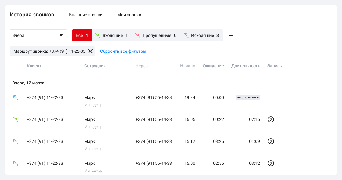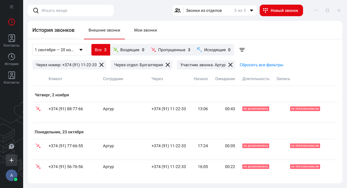 Благодаря фильтру «Контроль пропущенных» вы сможете легко найти непринятые звонки, на которые сотрудники не перезванивали или не дозвонились.