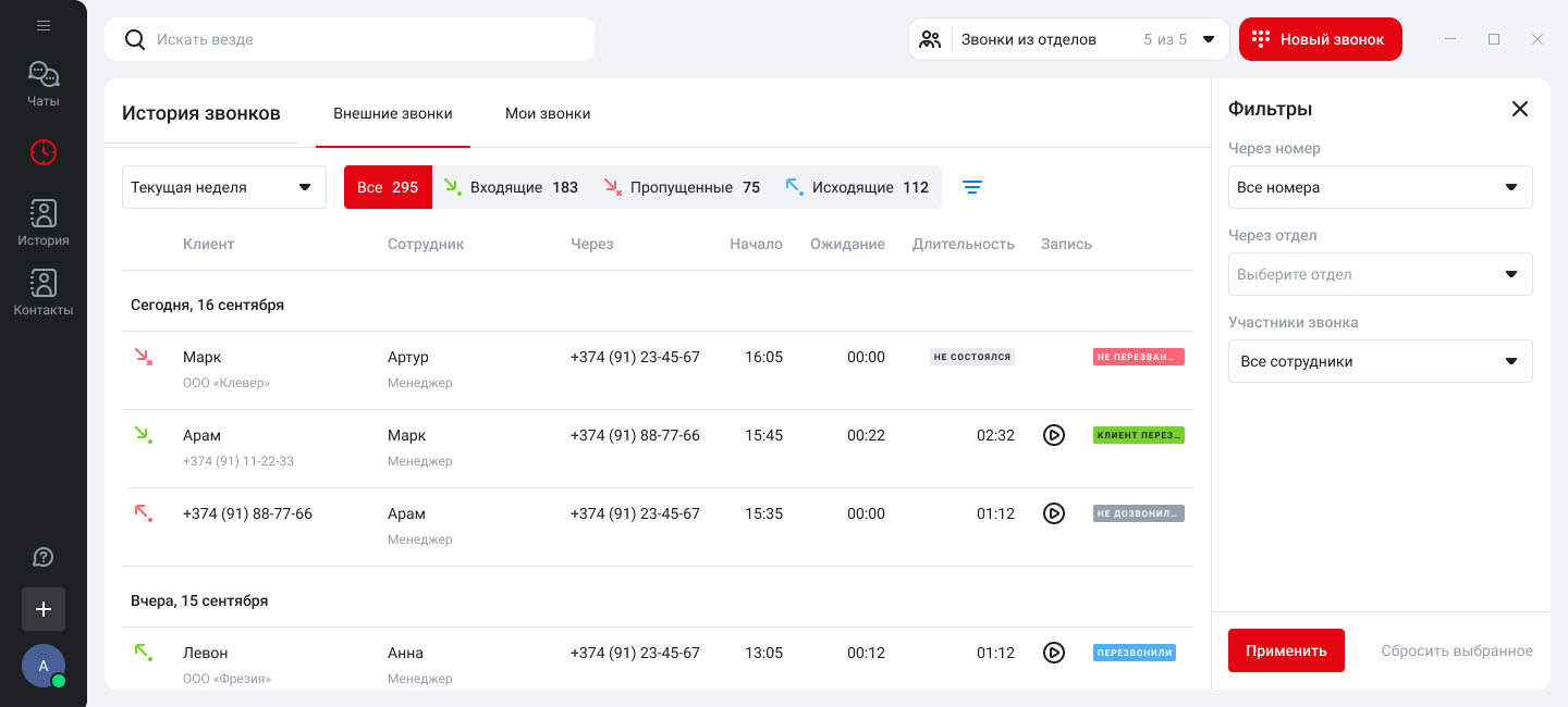 - фильтровать звонки по номерам, отделам, сотрудникам, клиентам и типам вызовов за нужный период;
