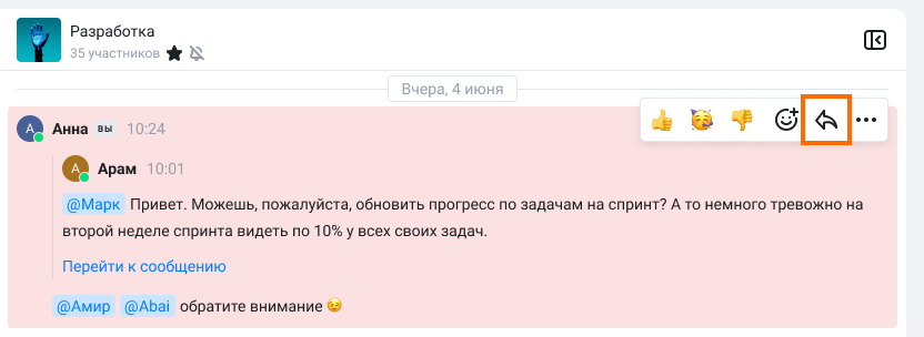 Рекомендуем использовать цитирование во время оживленной беседы в каналах, чтобы ваши собеседники поняли, на какое сообщение вы отвечаете. Для этого наведите курсор на нужное сообщение и нажмите на стрелку справа от него.