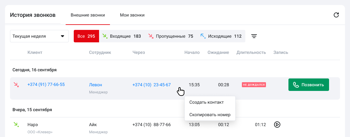 Чтобы перезвонить по пропущенному, наведите курсор на соответствующую строку и нажмите на кнопку «Позвонить» справа.
