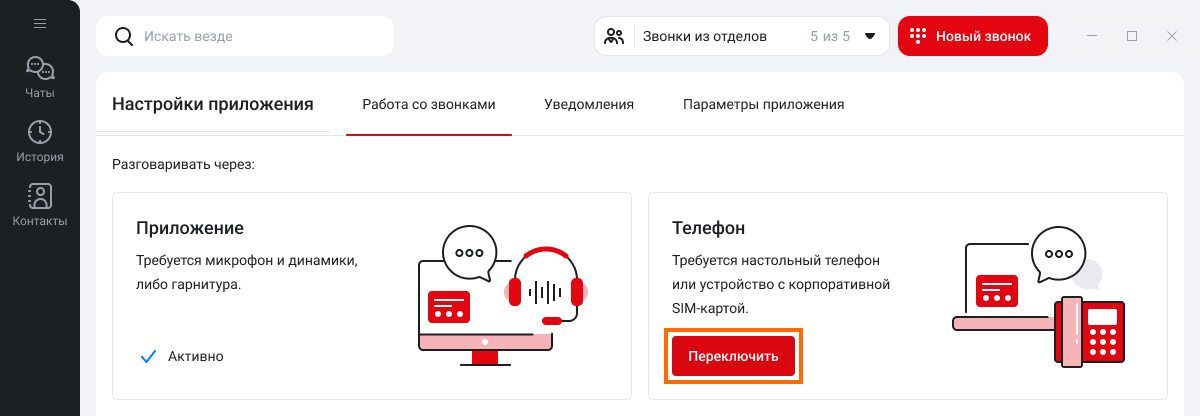 По умолчанию настроен прием и совершение звонков с компьютера. Чтобы принимать входящие звонки в приложении через IP-телефон, можно включить интеграцию через CTI. Для этого нажмите на кнопку «Переключить».
