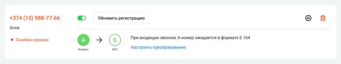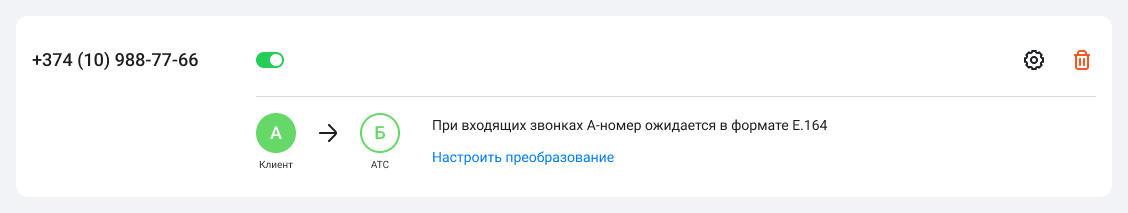 Также в настройках номера будет раздел «При входящих звонках А-номер ожидается в формате E.164». Это техническая информация и, чаще всего, сюда вносить изменения не требуется. Если ваш оператор связи работает не по стандарту E.164, здесь вы сможете настроить преобразование.